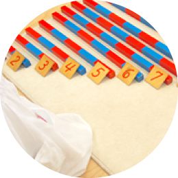 具体物を目で見て手で触り量を確かめる活動から始まり、次第に量と数字を一致させ、抽象化へと向かいます。このように段階づけられた教具を使って活動していくうちに、数のしくみを理解するようになります。また、子どもの中で感覚的に理解していた事柄が、数教育により秩序づけられ整理されていき、論理的な思考の土台となります。