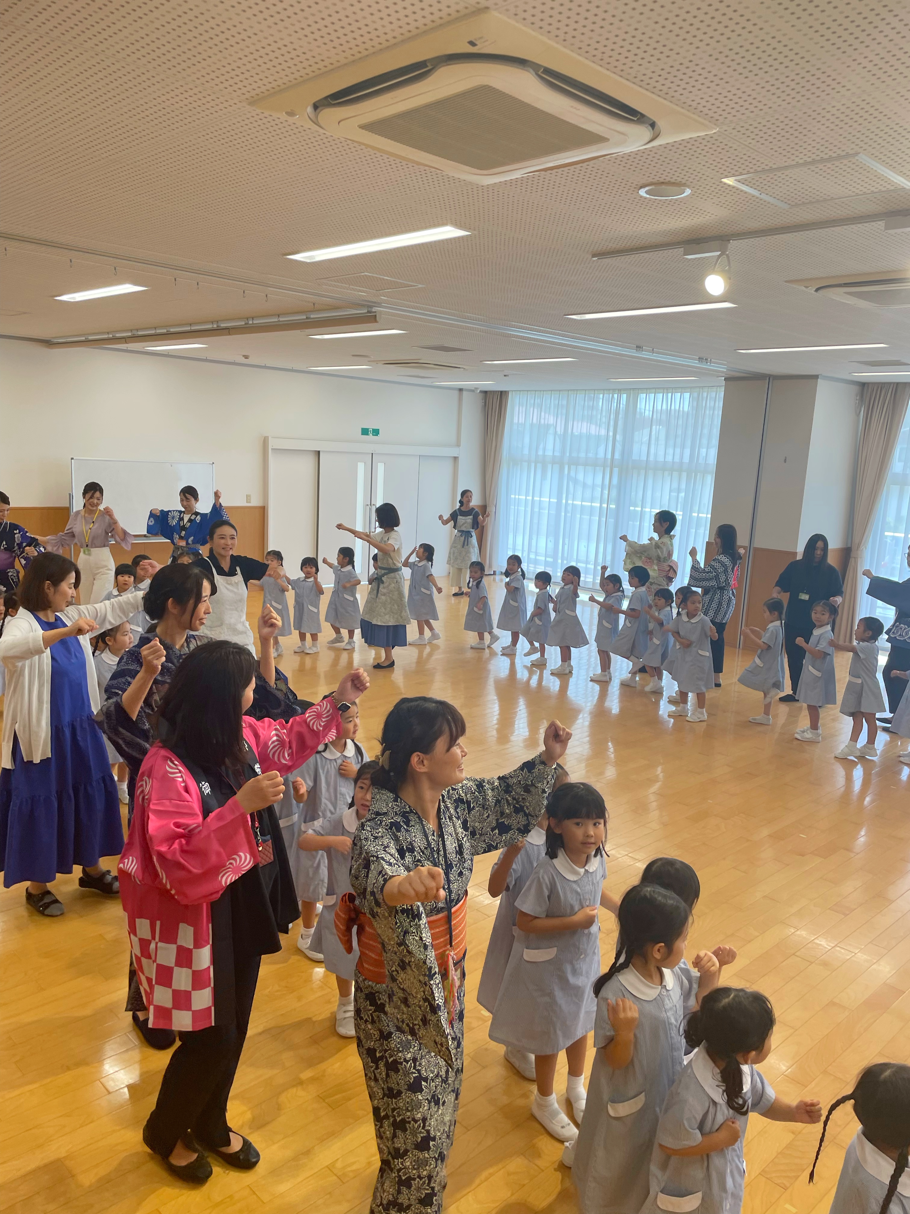 子どもたち、お手伝いの保護者の皆様と踊り