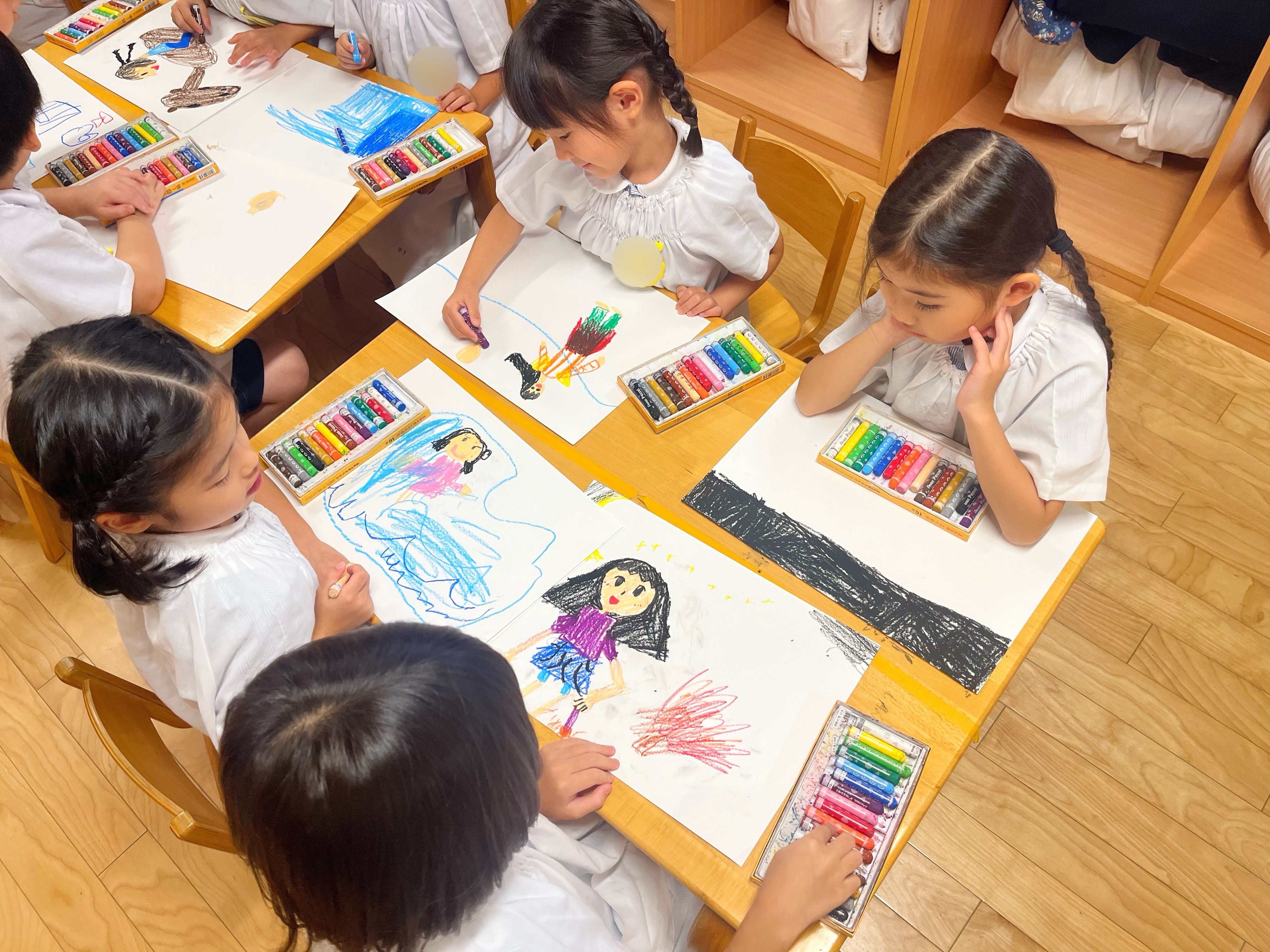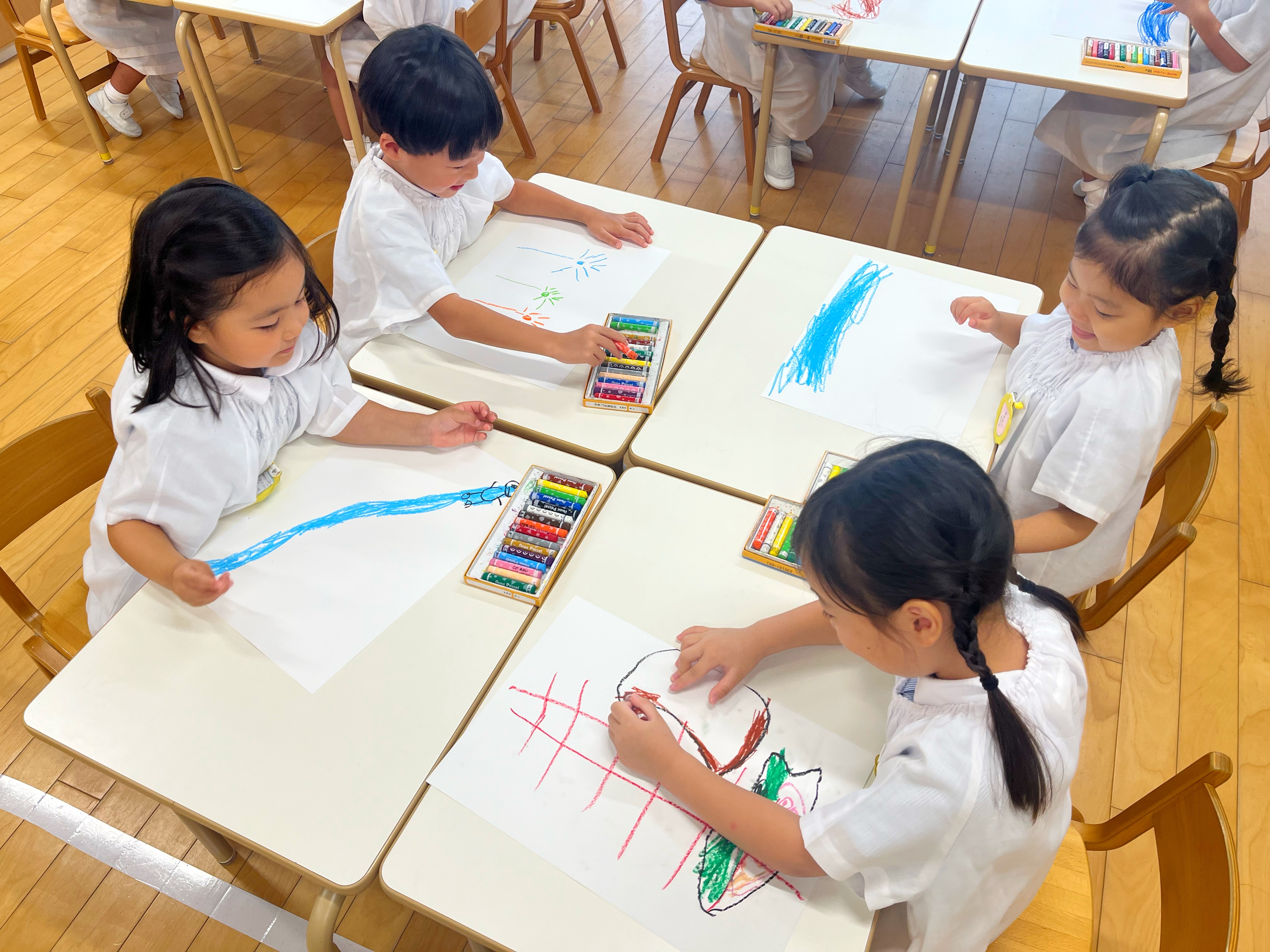 日常 2025.09.08 夏休みの思い出を描きました 先日夏休みの思い出を描きました。 「花火いっぱい描いたよ!」「カブトムシ見つけたんだ!」 といった会話が聞かれる中、流れるプールや花火、乗馬をしたことなど楽しかった夏休みを思い出しながら素敵な作品が仕上がりました。
