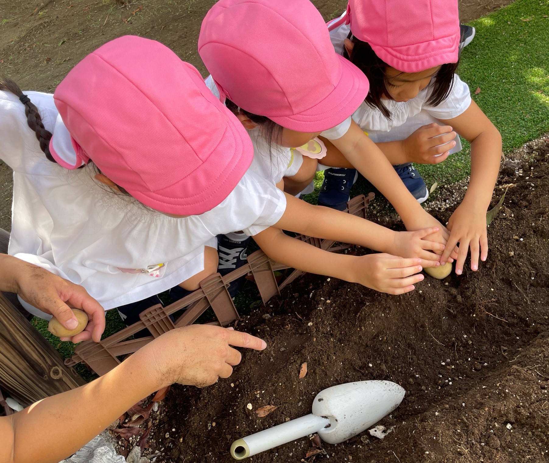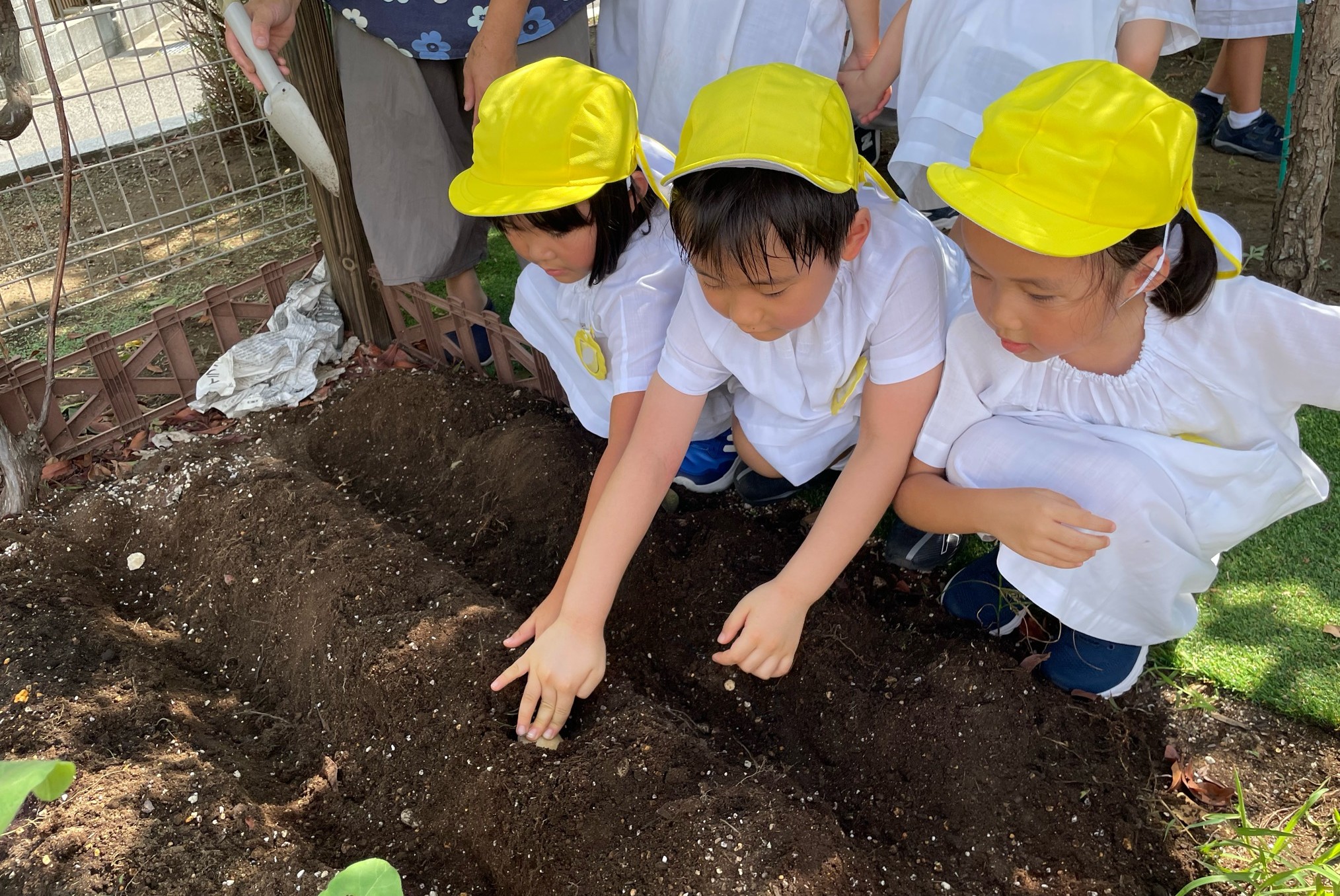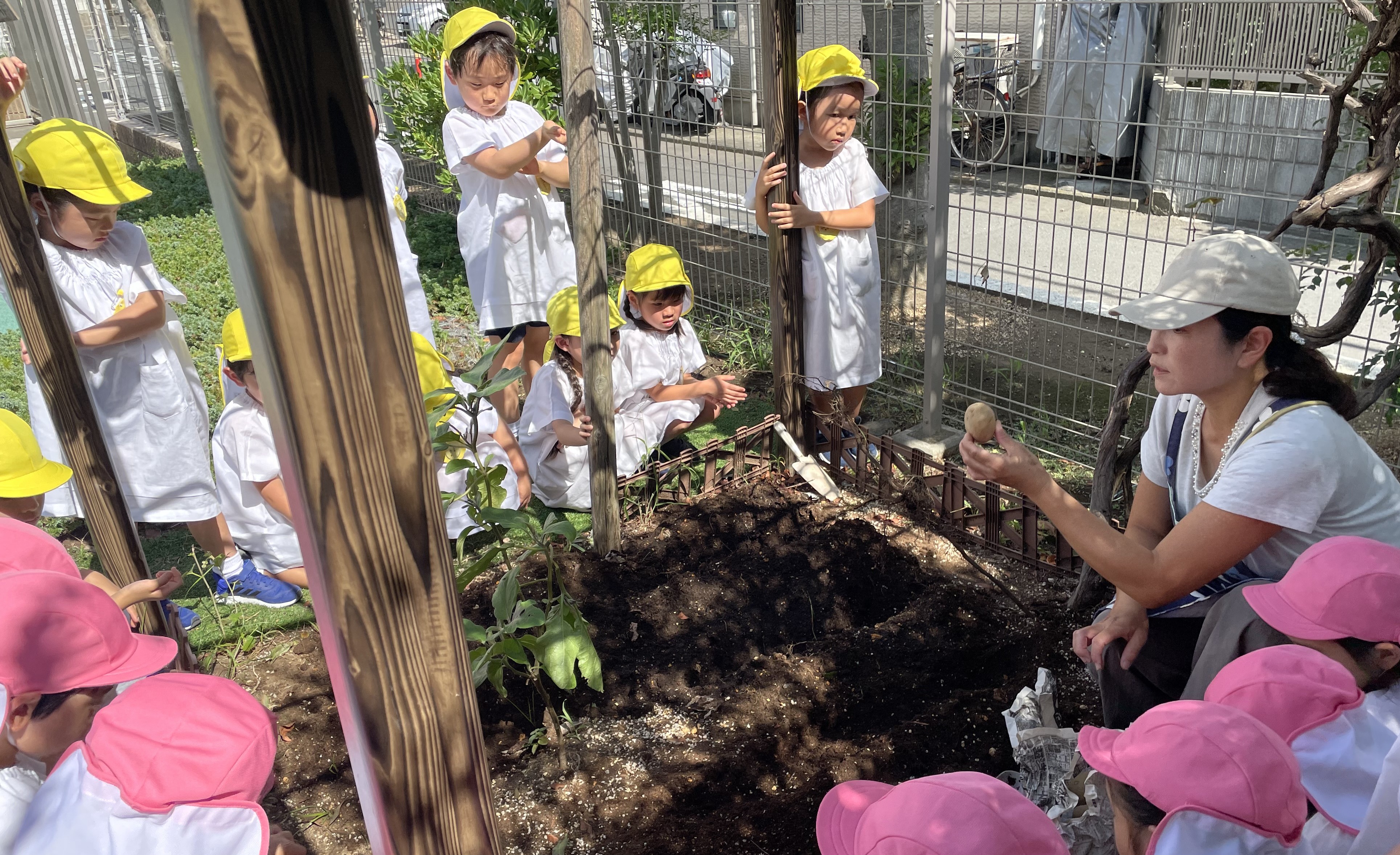 昨年に引き続き秋植えじゃがいもの種芋を植えました。畑に畝を作り、子どもたちに種芋を渡すと、芽が出ている部分に気づき、両手で大切に持っていました。年長児の畑のお当番さんが水やりをして、子どもたちとじゃがいもが育つ様子を観察していきます。