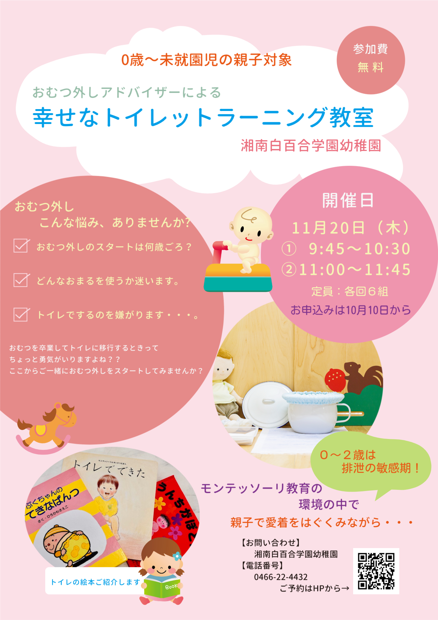 オムツ外しアドバイザーによる「幸せなトイレットラーニング教室」の申し込みのご案内です。