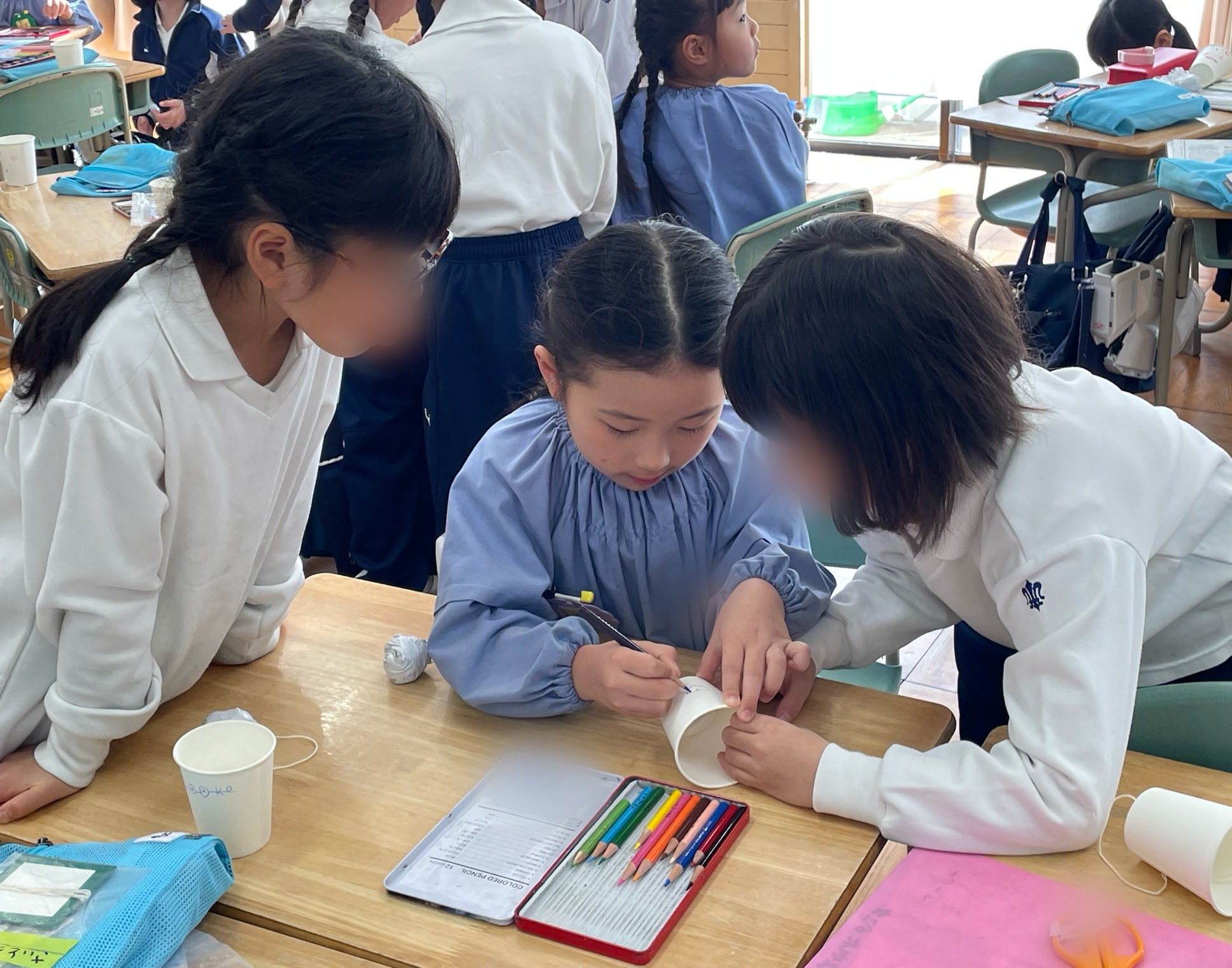 年長さんが湘南白百合学園小学校に行き、1年生と一緒に制作をして楽しい時間を過ごしました。