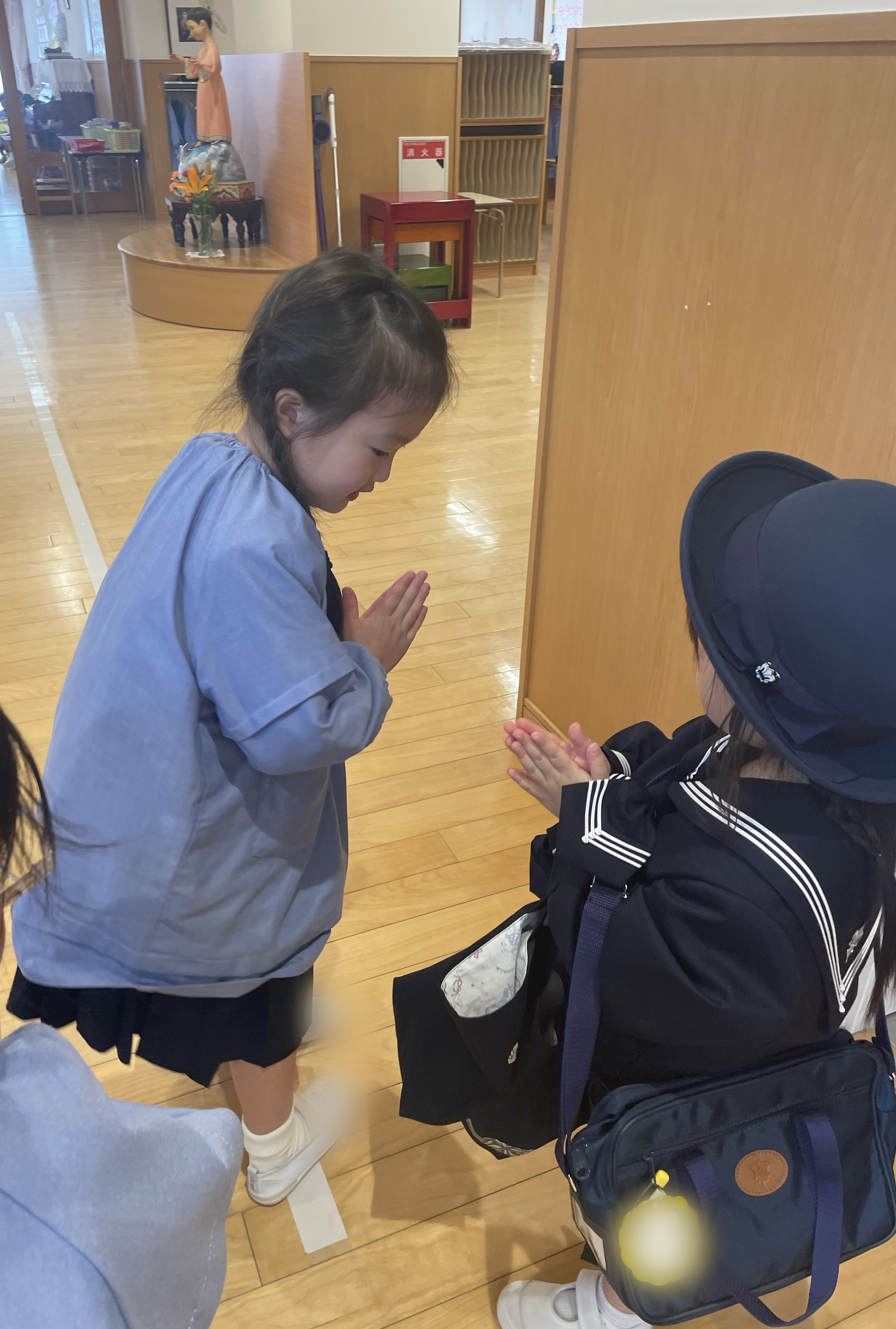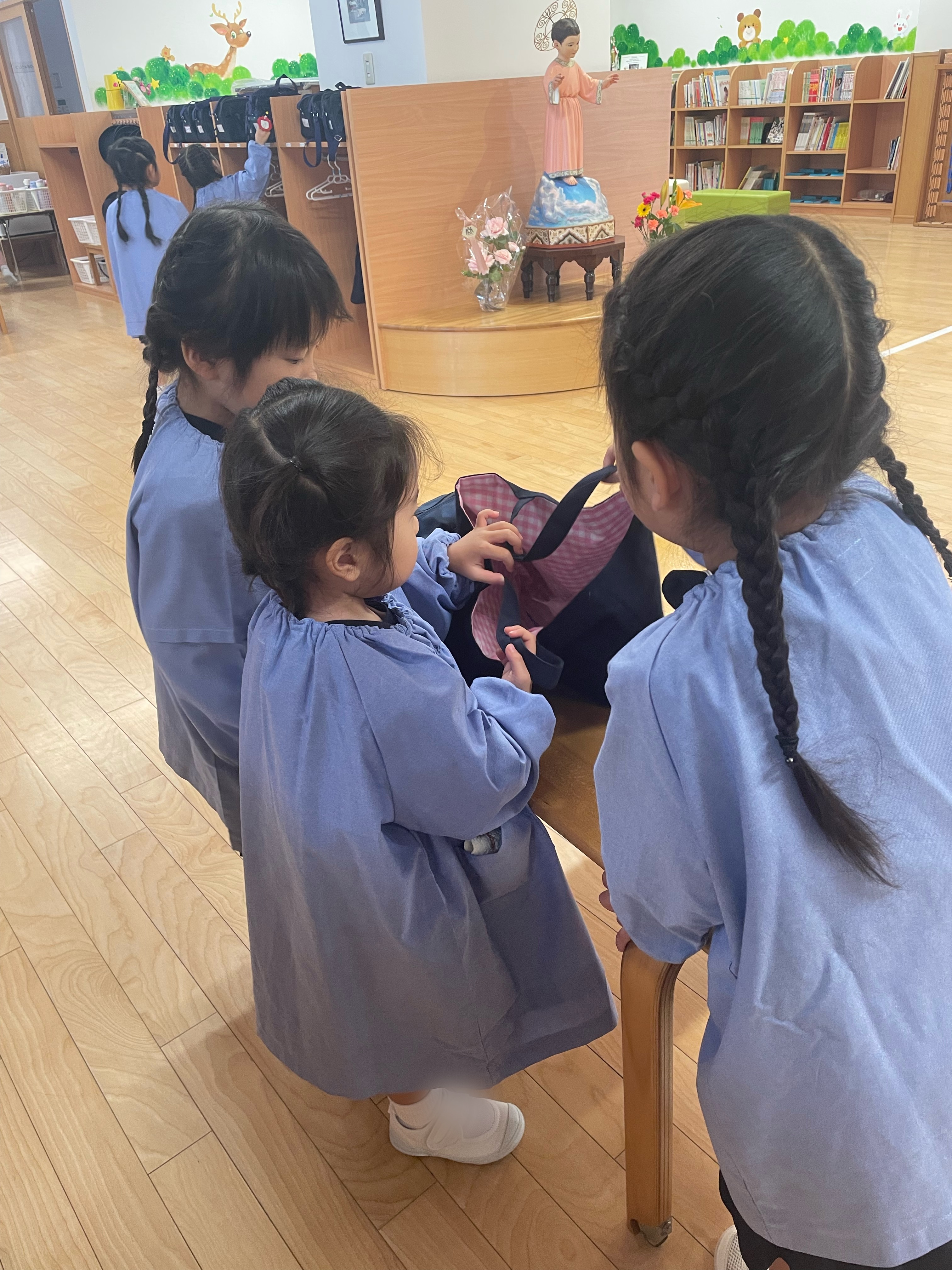 不安そうな表情をしたり泣いている子もいましたが、そんな年少さんの手を引き、身支度を教えてあげたり、本を読んであげたり、優しく寄り添う頼もしい年長さんの姿がありました。