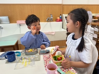 「見て見て!」「おいしいね!」と、お友達とのやりとりも楽しみながら、心もお腹も満たされるひとときになっています。